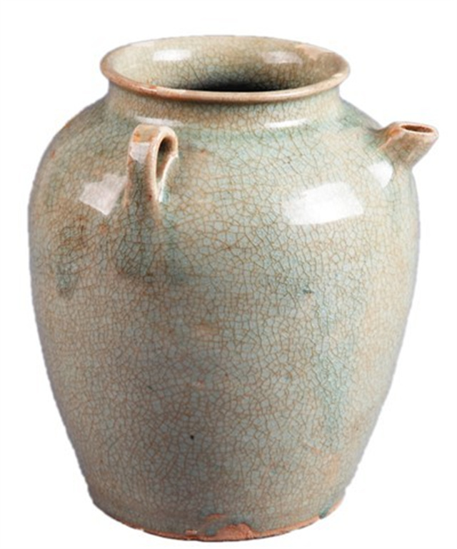 梅縣水車窯是粵東地區(qū)著名的青瓷窯,創(chuàng)于初唐,盛于中晚唐,其產(chǎn)品曾沿著海上絲綢之路遠(yuǎn)銷東南亞和西非地區(qū)。水車窯青瓷是客家先民的日常生活器物,器型豐富,質(zhì)量精良。唐代青釉雙系壺是館藏水車窯瓷器中的代表作品。此壺胎色呈灰青色,胎質(zhì)堅硬、厚實。微侈口,短頸,雙豎耳,肩部飾雙系及一短嘴流,平底。外形穩(wěn)重壯實,是水車窯最具山地特色的造型品種之一。除足底外通身施釉,青釉純正,釉質(zhì)類冰似玉。