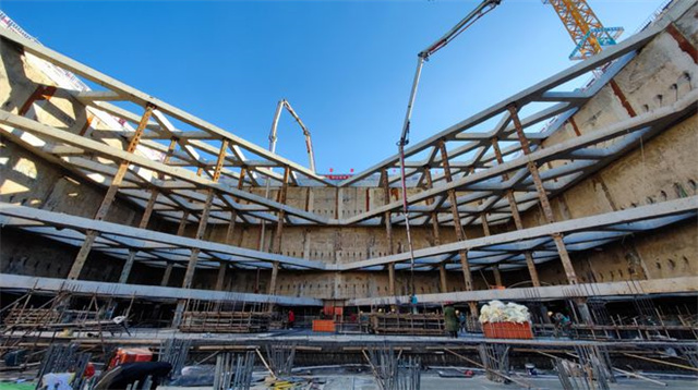 施工現(xiàn)場,已經(jīng)完成的主體結(jié)構(gòu)表面高低錯落,讓人感覺起伏多變,劉杰介紹,地面起伏多變其實是“反梁”工藝,是為了保證地下屋面的順滑流暢,將原本需要向下突出的橫梁改為向上突出,呈現(xiàn)出表面標(biāo)高復(fù)雜的情況。由于未來地面僅有2000平方米的配套建筑,其余都是綠化景觀,“反梁”的設(shè)計既實現(xiàn)了地下效果最優(yōu),也避免影響地面景觀。