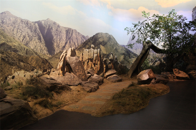 巖畫(huà)被史學(xué)界喻為“形象的語(yǔ)言,藝術(shù)的史詩(shī)”。巖畫(huà)作為包頭博物館的特色展品之一,記錄著古代北方游牧民族生產(chǎn)生活的點(diǎn)點(diǎn)滴滴,展現(xiàn)了北方游牧民族發(fā)展的艱辛歷程和連續(xù)篇章。包頭博物館努力為廣大觀眾營(yíng)造沉浸式觀展體驗(yàn),巧妙利用原展廳空間和斜坡式屋頂?shù)奶攸c(diǎn),通過(guò)全景式立體展示的方式,營(yíng)造出草原大漠神秘而幽遠(yuǎn)的氛圍,通過(guò)再現(xiàn)巖畫(huà)的生成環(huán)境,帶給觀眾身臨其境之感,使觀眾在“天人合一”的藝術(shù)意境中,感受回歸大自然的夢(mèng)幻感覺(jué),體味巖畫(huà)的獨(dú)特藝術(shù),領(lǐng)略古代文明的魅力。