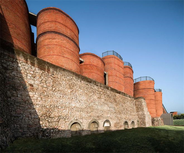 為了突出舊石灰窯,設(shè)計(jì)師刻意弱化博物館的形態(tài)及色彩,將其“藏匿”于舊石灰窯的背后,并將部分展示空間“壓”入地下,使得博物館的高度低于舊石灰窯。