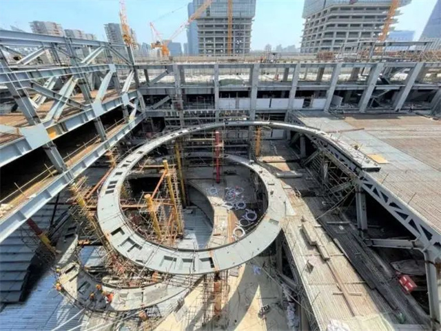 在單體內(nèi)部,有約200米長(zhǎng)的旋轉(zhuǎn)坡道,重量約為280噸。面板、底板、橫隔板和內(nèi)隔板密集排列,焊接工作量巨大。在有限施工空間內(nèi),建設(shè)者們利用高空拼裝施工工藝,以吊索進(jìn)行出裝預(yù)拼,再對(duì)吊索分批次分階段預(yù)應(yīng)力張拉,促使旋轉(zhuǎn)坡道完成最終受力體系轉(zhuǎn)換,完成拼接。