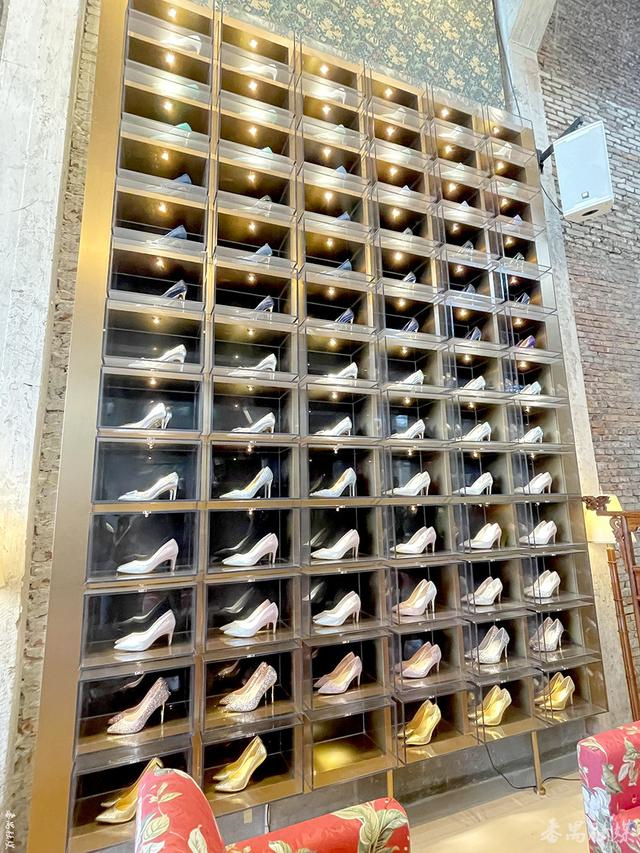 記者獲悉,館內(nèi)除了擺設了哈維夫婦歷年來的作品外,還有一個大型的玻璃鞋柜,里面擺放著多雙不同風格類型的高跟鞋。“王倍林原來是一名從事了二十多年鞋類行業(yè)的工作者,多年來她設計了多款婚鞋,她希望能將婚鞋元素融入到博物館里,因此我們也從過往設計過的鞋子中,選擇了跟高9.5厘米且最有代表性的高跟鞋,放在了架子上。”工作人員回答道。
