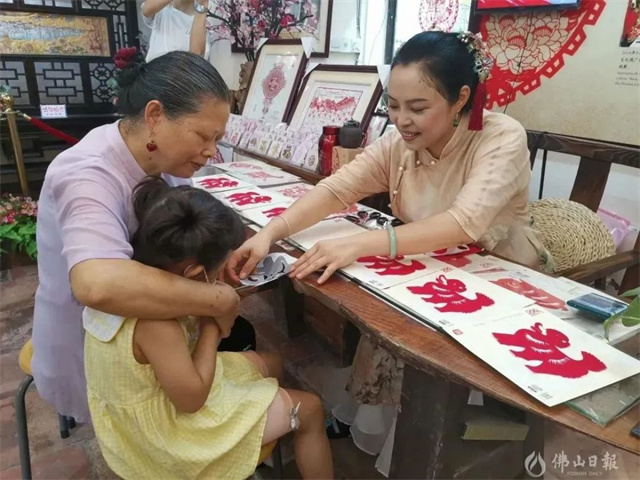 南風古灶旅游區(qū)進駐了饒寶蓮等一批非遺傳承人工作室。圖為佛山剪紙非遺傳承人饒寶蓮正在教小朋友做剪紙。