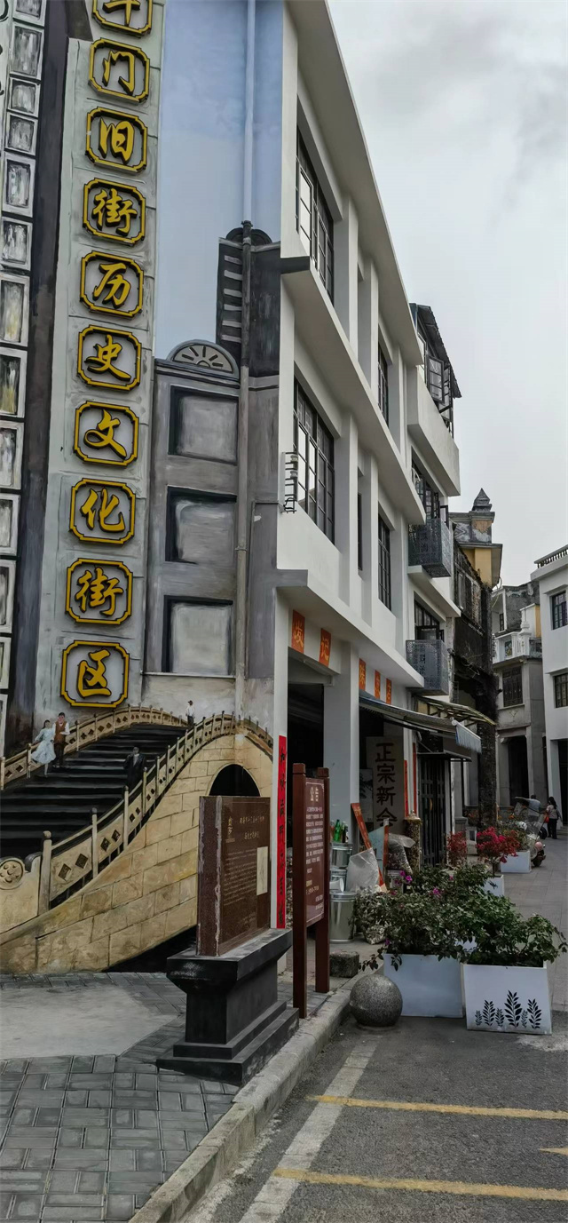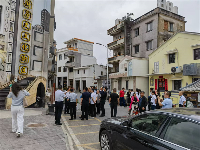 周勇會長一行首先來到了斗門歷史文化街區(qū)。斗門舊街位于斗門鎮(zhèn)核心區(qū)域,十九世紀末到二十世紀初由加拿大牧師、建筑工程師嘉理慰等人規(guī)劃設(shè)計,是一條具集市貿(mào)易功能的商業(yè)街。全街呈“丁”字形,全長500多米,街道兩旁是緊密排列的騎樓商鋪,建筑風格獨特,博采歐美各國古典建筑之精華、吸取南洋島國之建筑理念、秉承中國嶺南建筑之風騷。斗門舊街在明嘉靖年間就形成了墟市,發(fā)展于清雍正十一年,2022年2月,珠海市為了更好的保護舊街古跡、再現(xiàn)地方特色和文化價值,對其啟動了修繕工程,先后修繕了包括20棟歷史建筑、30棟風貌建筑、24棟一般建筑在內(nèi)的74棟建筑,修繕內(nèi)容包括對外墻面翻新、灰塑壁畫修復(fù)、門窗保養(yǎng)及部分環(huán)境風貌整治等。