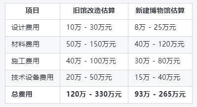 估算:新建博物館的設計費用通常在每平米80-250元之間,假設面積為1000平米,設計費用大致為8萬元到25萬元。