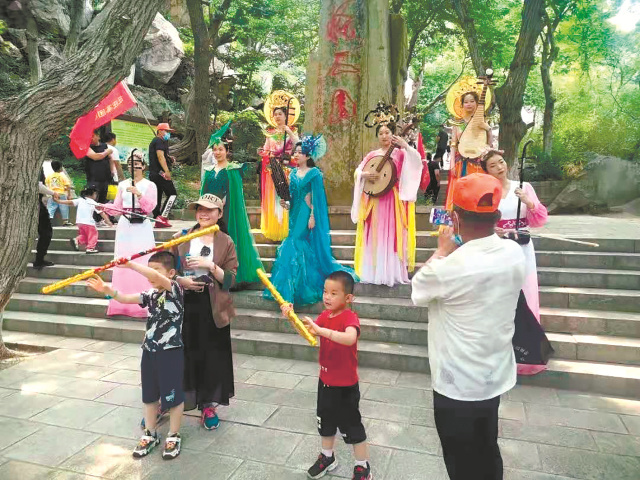 水簾洞前,瀑布飛練,演奏員們專業(yè)的演出讓游客駐足欣賞,掌聲不絕;玉女峰頂,遠(yuǎn)山近海,演奏員們矗立巨石疊壘中,樂音空靈,游人恍如置身天宮——這是江蘇女子民族樂團在花果山上演出文旅劇《樂見西游》的一幕。