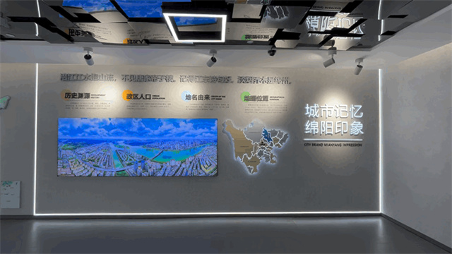 以圖文展板形式對綿陽基本情況進行總體介紹,巧妙利用廊道空間,依次展示綿陽歷史人文、科技創(chuàng)新、產(chǎn)業(yè)經(jīng)濟及生態(tài)民生等方面城市發(fā)展優(yōu)勢與近年來的建設成就。