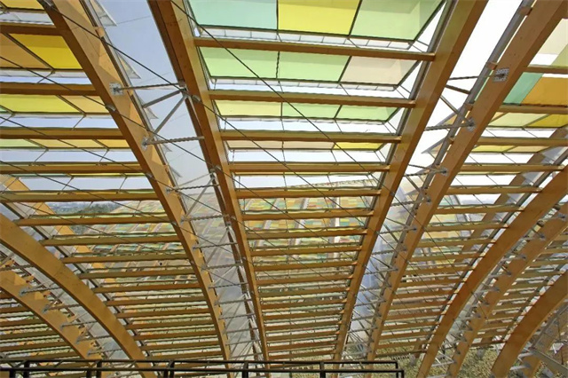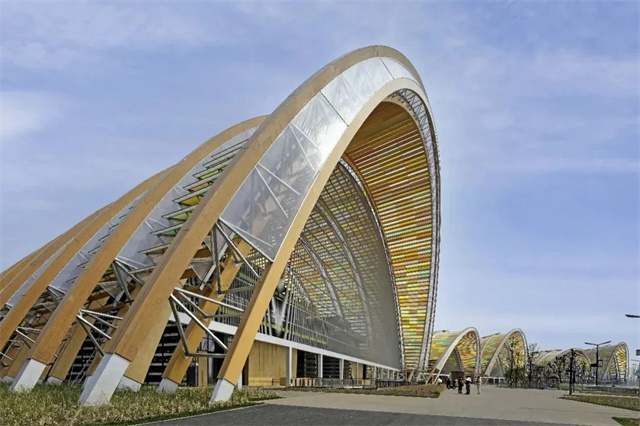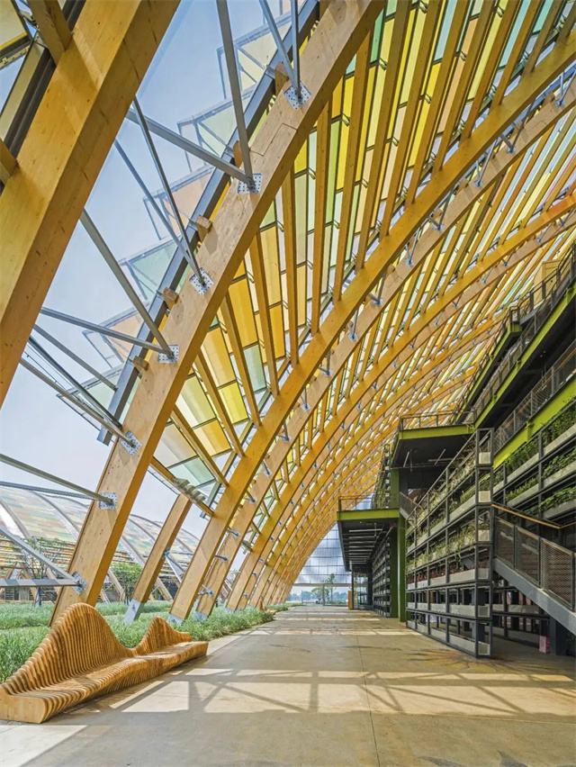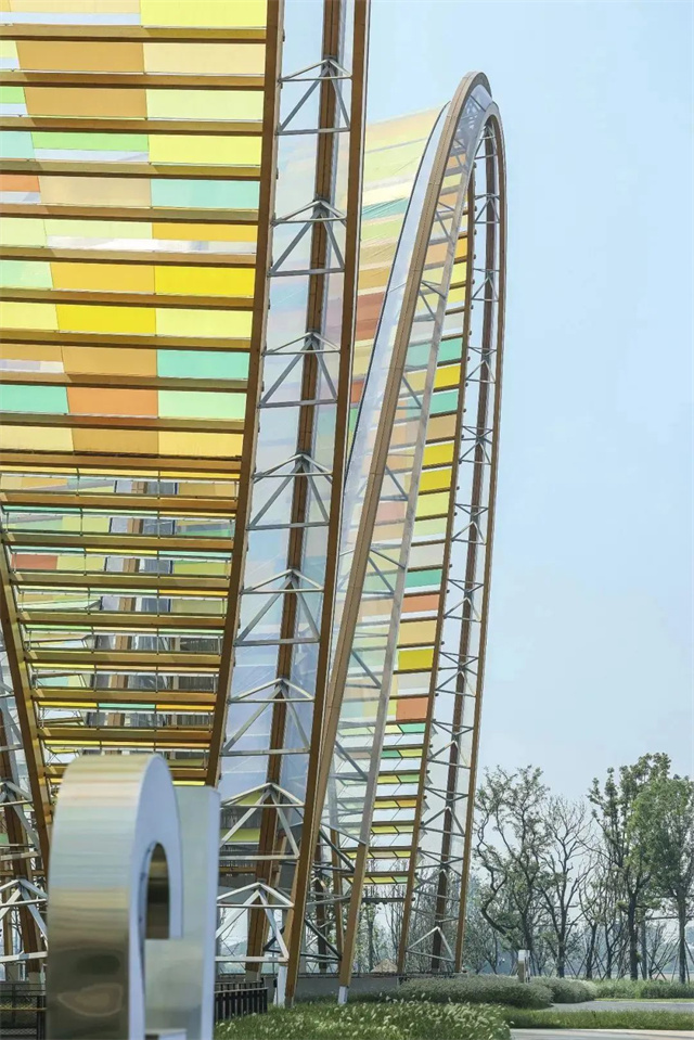 建筑選用了負(fù)碳材料膠合木作為棚架的主要結(jié)構(gòu)材料,輕質(zhì)炫彩的ETFE膜材作為主要圍護(hù)材料,這兩者的融合運(yùn)用為天府大地增色添彩。