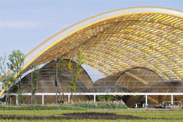 農(nóng)博會(huì)主展館由5組巨型木構(gòu)棚撐架,宛若道道飛虹,與廣袤的田野尺度相稱(chēng),高低起伏、空透輕巧。指狀開(kāi)放的布局讓建筑與大田交織相融,室內(nèi)復(fù)合化的會(huì)議、會(huì)展、商業(yè)、孵化等功能區(qū)給建筑的使用提供了多種可能。